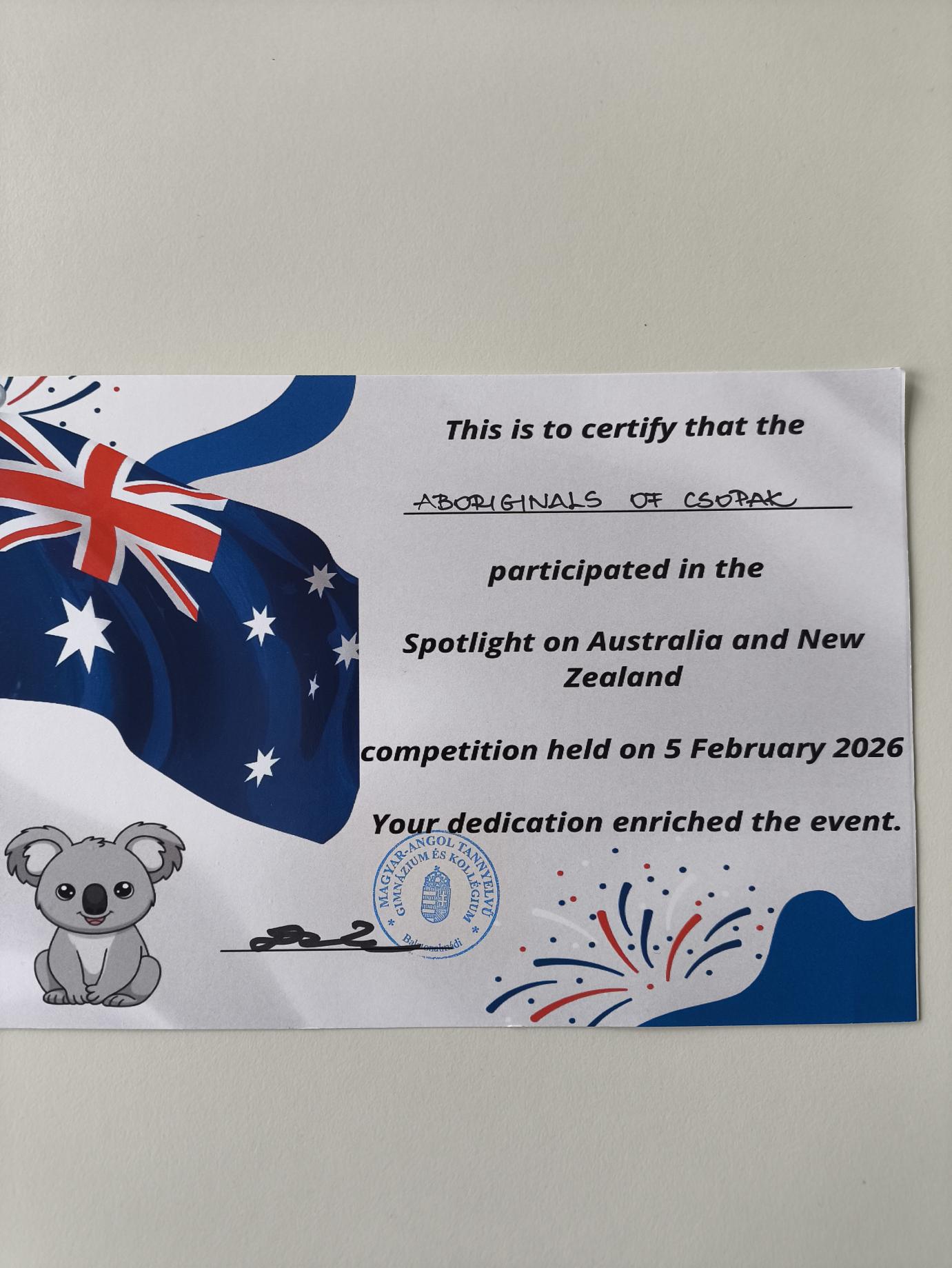 Hetedik osztályos tanulóink a Magyar-Angol Tannyelvű Gimnázium és Kollégium, Balatonalmádi SPOTLIGHT ON AUSTRALIA AND NEW ZEALAND angol nyelvű, játékos, kreatív feladatokat tartalmazó csapatversenyén szerepeltek eredményesen. A verseny nagy kihívás elé állította diákjainkat.