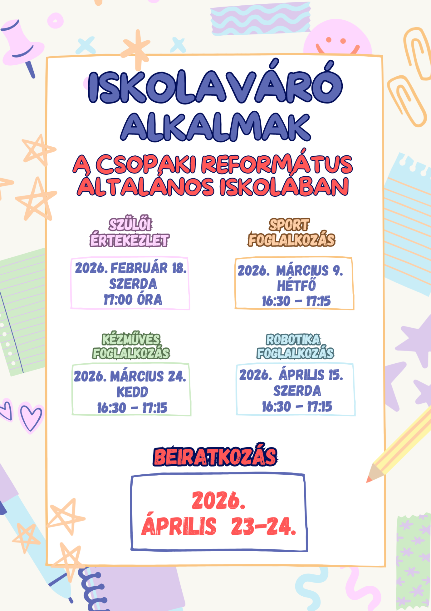ISKOLAVÁRÓ SZÜLŐI ÉRTEKEZLET Szeretettel várjuk a leendő elsős gyermekek szüleit 2026. február 18-án szerdán, 17 órakor kezdődő tájékoztató szülői értekezletre!