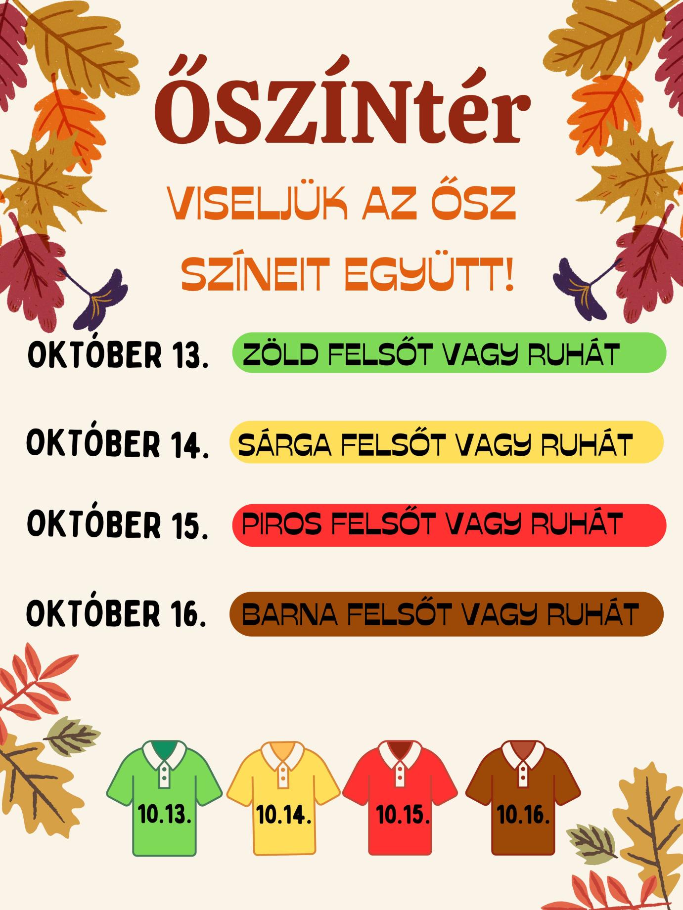 JÖVŐ HÉTEN ÚJRA ŐSZÍNtér 🍂 Hétfőtől csütörtökig hozzuk be az ősz színeit az iskola falai közé! Öltözzünk az ősz színeibe közösen!