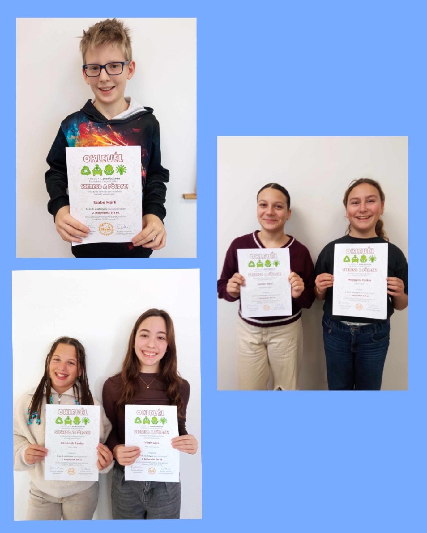 Hatodik osztályos tanulóink is előkelő helyezéseket értek el a Hebe Kft. által meghirdetett Szeresd a Földet! országos természetvédelmi projektversenyen.