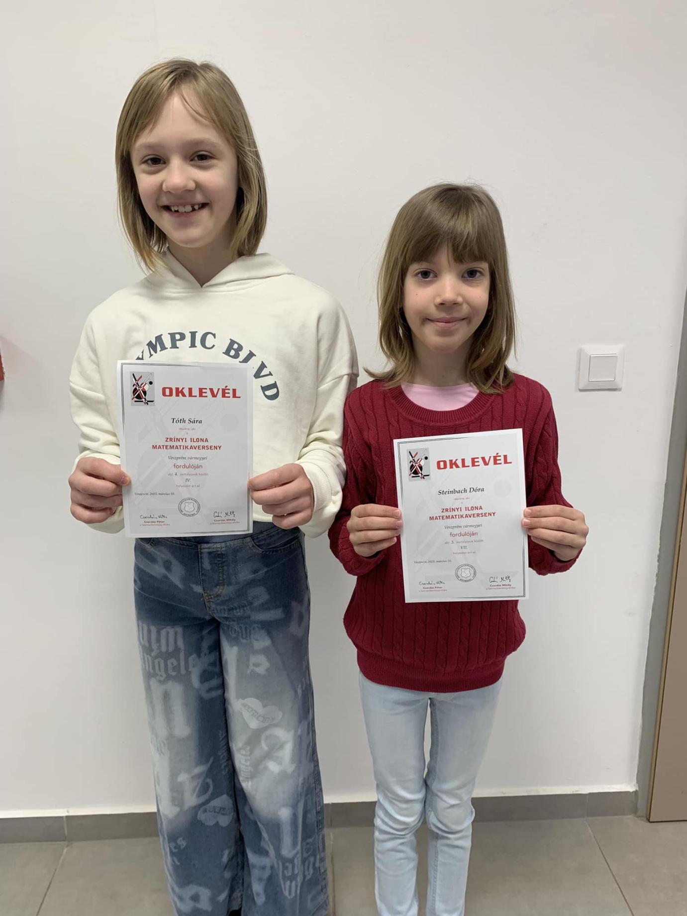 Gratulálunk iskolánk két diákjának Steinbach Dórának (3.o.) és Tóth Sárának (4.o.), akik a Zrínyi Ilona matematikaverseny Veszprém vármegyei fordulóján kiemelkedő eredményt értek el! Dóra a 7. helyen, Sára pedig 4. helyen végzett! Büszkék vagyunk rátok!